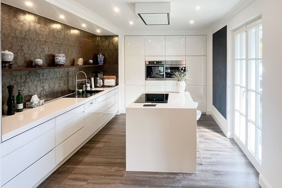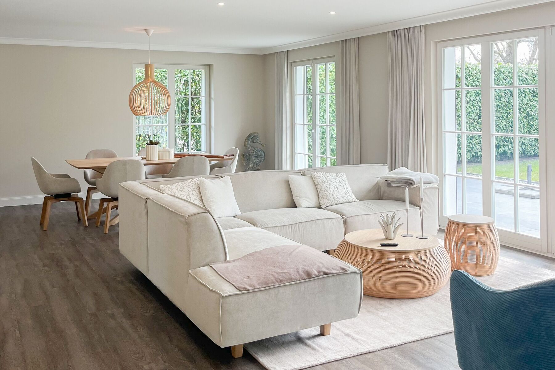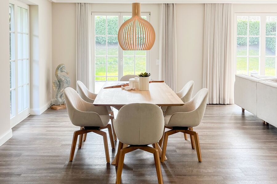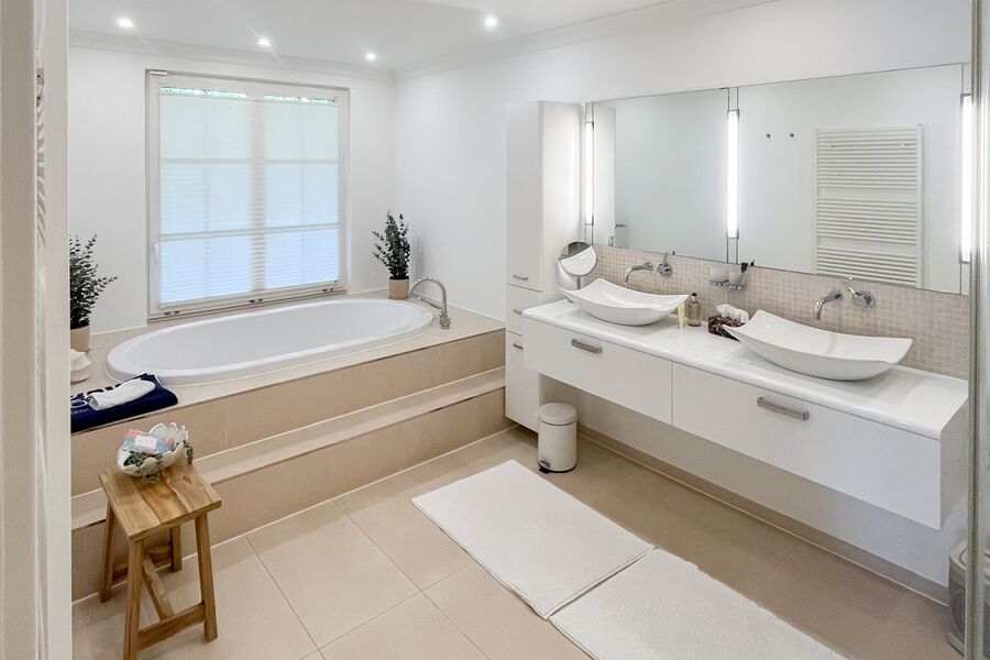 Es erwartet Sie ein wunderschöner Bungalow, der bereits beim Eintreten Behaglichkeit und Wohlbefinden vermittelt. Warme Farben, viel Licht und die äußerst hochwertige Ausstattung garantieren höchsten Wohnkomfort für den anspruchsvollen Gast. Alle Fenster sind mit elektrischen Außenjalousien versehen und die Fußbodenheizung sorgt für ein angenehmes Raumklima. 145 qm Wohnfläche auf einer Wohnebene bieten ausreichend  Raum für 4 Personen, um einen entspannten Ostseeurlaub in Strandnähe zu verleben. Es erwartet Sie ein äußerst großzügig bemessener und hochwertig eingerichteter Wohn- und Essbereich mit Blick auf die Sonnenterrasse in Südausrichtung, die sich über die gesamte Hausbreite erstreckt und von einem privaten Gartengrundstück umgeben ist. Loungemöbel, Sonnenliegen und Gartenmöbel laden dazu ein, viele gemütliche Stunden im Freien zu verbringen. Ein Highlight ist definitiv die große und perfekt ausgestattete Wohnküche, die alle Annehmlichkeiten bietet, um jeden Hobbykoch zu begeistern. Hier können Sie sich in geselliger Runde beim Kochen austauschen und kreativ sein. Die beiden äußerst geräumigen Schlafzimmer sind mit Boxspringbetten (180x200), Smart-TV und ausreichend Schrankfläche ausgestattet. Es steht ein exklusives Bad ensuite mit XL Badewanne, ebenerdiger Dusche, WC, Bidet und Doppelwaschtisch zur Verfügung. Das zweite Bad ist mit einer ebenerdigen Dusche, Waschbecken und WC ausgestattet. In einem separaten Abstellraum sind Waschmaschine und Trockner untergebracht. Auf dem Grundstück befinden sich 2 PKW-Stellplätze und Fahrräder können trocken unter dem Carport abgestellt werden.