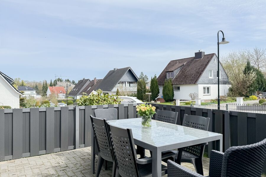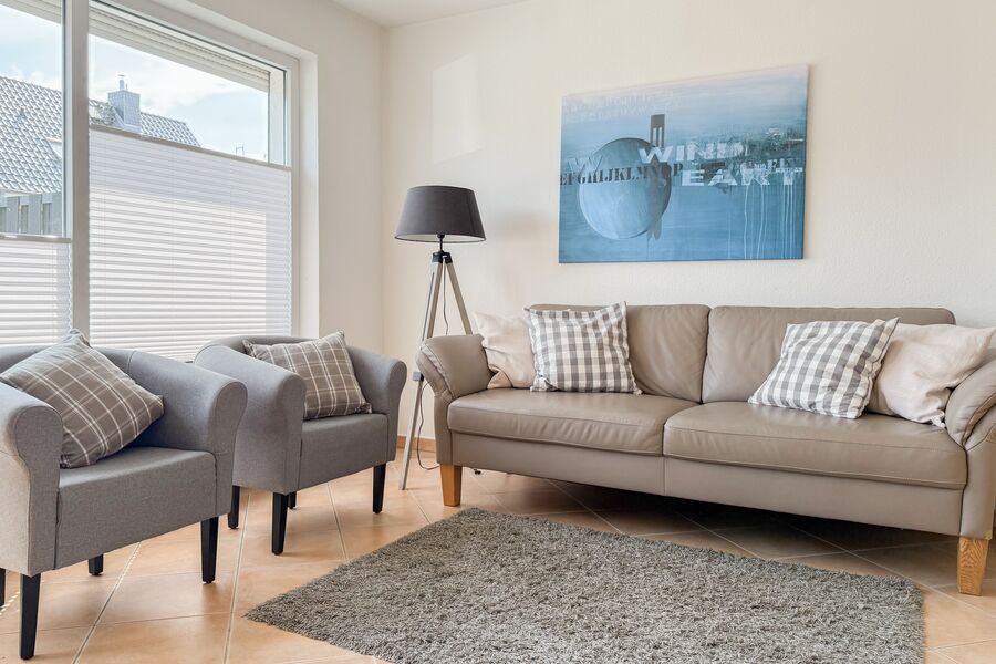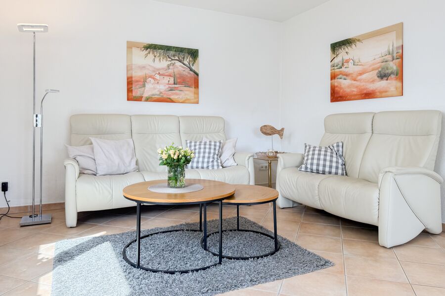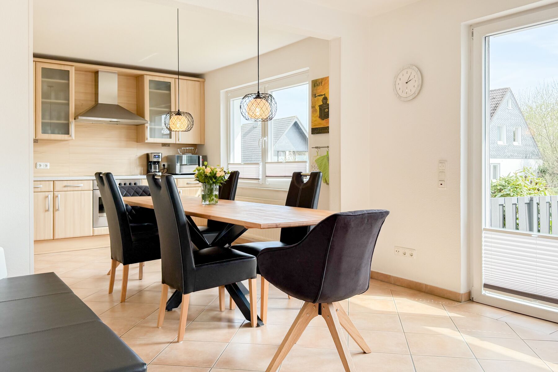 Das Ferienhaus Melanie bietet auf über 100 qm Wohnfläche mit 3 Schlafzimmern ausreichend Platz für 6 Personen plus Kleinkind, um einen entspannten Urlaub zu verleben. Im Erdgeschoss befindet sich ein gemütlicher Wohnbereich, hell und freundlich, mit TV, DVD Player, WLAN und Musikanlage. Angrenzend gibt es einen weiteren Sitz- oder Lesebereich mit einem Sofa mit Schlaffunktion und Zugang zur möblierten Süd Terrasse. Die zweite möblierte Terrasse mit Gasgrill ist zum Westen ausgerichtet und befindet sich im hinteren Teil des Gartens vor dem Garagenhaus. Das Herzstück bildet die offene Wohnküche in bester Ausstattung mit allen technischen Geräten und der großzügig angelegte Essbereich, sonnig und hell dank viel Fensterfläche. Ein großes Gäste WC mit Waschmaschine und Trockner ist ebenfalls im Erdgeschoss untergebracht.