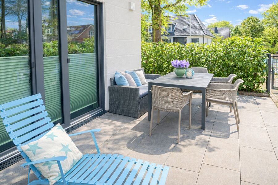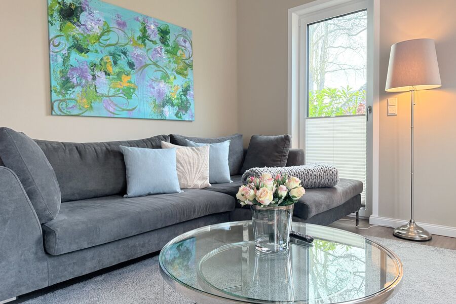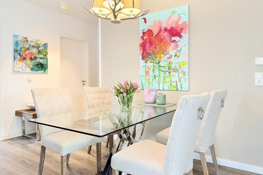Es erwartet Sie eine äußerst hochwertig ausgestattete und geschmackvoll eingerichtete Ferienwohnung, die mit 2 separaten Schlafzimmern ausreichend Raum für 4 Personen bietet, um einen entspannten Urlaub in einem herrlichen Ambiente zu verleben. Fußbodenheizung, elektrische Außenjalousien und bodentiefe Fensterelemente, die für ein offenes Raumgefühl sorgen, gewährleisten einen hohen Wohnstandard. Mittelpunkt der Ferienwohnung bildet die Siematic Design Küche mit Kochinsel in bester Ausstattung, die zum gemeinsamen Kochen einlädt und der anschließende Essbereich im Hampton Style. Der behagliche Wohnbereich, eingerichtet mit Sofa und TV, bietet Blick und Zugang auf die großzügig angelegte Westterrasse mit Gartenmöbeln und Sonnenliegen, um den Tag bei einem Glas Wein mit Ostseeblick ausklingen zu lassen. Beide Schlafzimmer bieten einen herrlichen Ausblick bis auf bis auf das Meer und sind mit hochwertigem Teppichboden, Doppelbetten (180x200) und einem Kleiderschrank ausgestattet. In einem der Schlafräume befindet sich ein zusätzlicher Fernseher. Im Flur des Eingangsbereichs steht ein weiterer Einbauschrank für Jacken und Mäntel zur Verfügung. Das Bad ist sehr hochwertig und modern, ausgestattet mit einer XXL Walk In Dusche. Waschmaschine und Trockner befinden sich in einem Einbauschrank. WLAN steht selbstverständlich zur kostenlosen Nutzung zur Verfügung. Fahrräder können auf der Terrasse der Wohnung abgestellt werden.