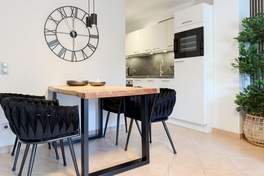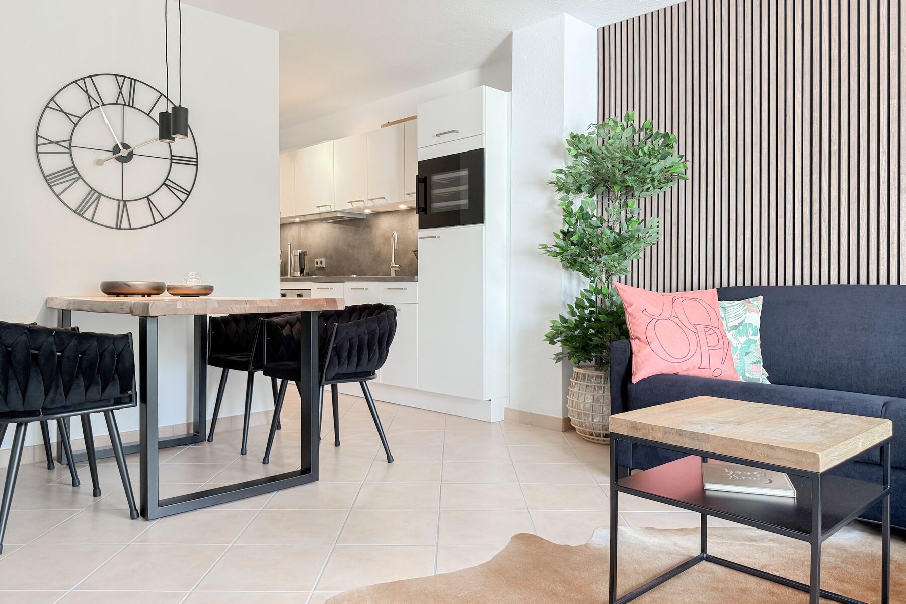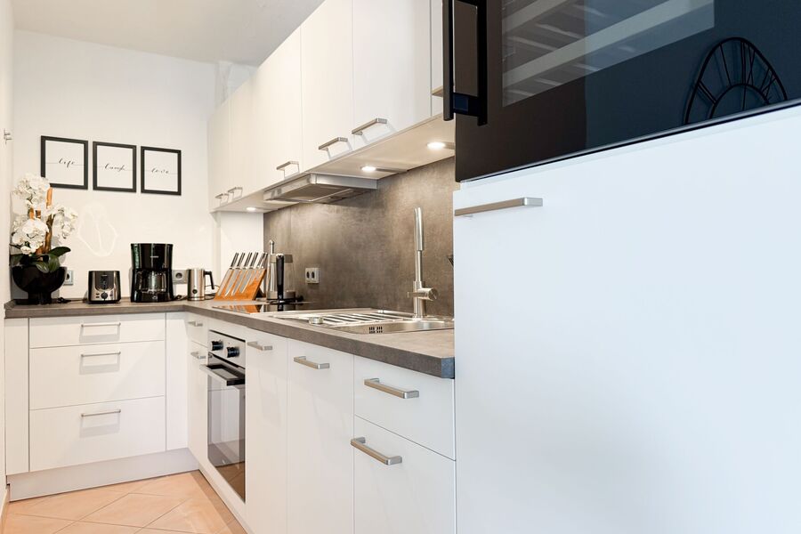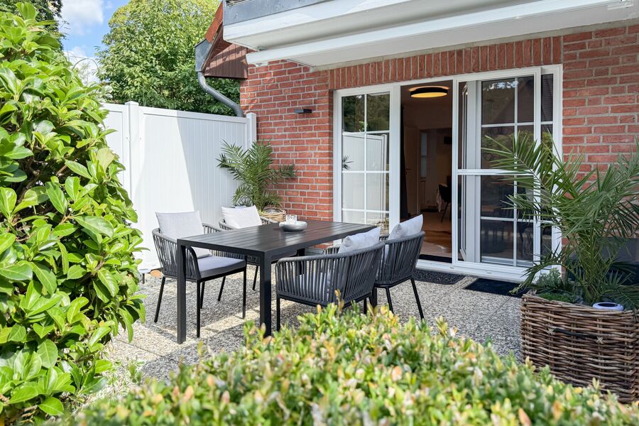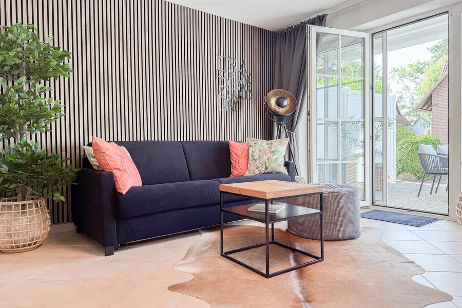 Die hochwertig eingerichtete und bestens ausgestattete Ferienwohnung eignet sich ideal für 3 Personen, die ihren Urlaub in stilvollem Ambiente genießen möchten. Die Terrassenwohnung mit separatem Eingang liegt am Rand der gepflegten Wohnanlage Gorch-Fock-Park und garantiert Ruhe sowie Privatsphäre. Der Wohnbereich überzeugt durch ein komfortables Sofa mit Schlaffunktion, Smart-TV und Bluetooth-Radio. Der anschließende Essbereich bietet ausreichend Platz, und die offene, neu integrierte Küche fügt sich harmonisch in den Raum ein. Sie ist unter anderem mit Weinkühlschrank, Spülmaschine, Backofen, Induktionsherd, Gefriermöglichkeit und vielem mehr ausgestattet. Genießen Sie sonnige Stunden auf der Südterrasse, die mit einer elektrischen Markise sowie Gartenmöbeln ausgestattet ist.